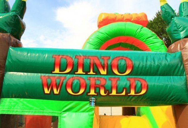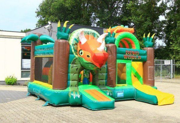 Een multi-play springkasteel waar de kinderen zich in een Dino-wereld bevinden.